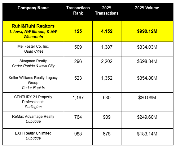 Ruhl&Ruhl Realtors has once again been ranked as the largest independent real estate company in Iowa for 2025, according to the HousingWire RealTrends Verified report. The annual report ranks the top 500 real estate firms in the United States based on residential transaction sides and sales volume. Ruhl&Ruhl Realtors ranked 125th nationally based on 4,152 transactions closed.