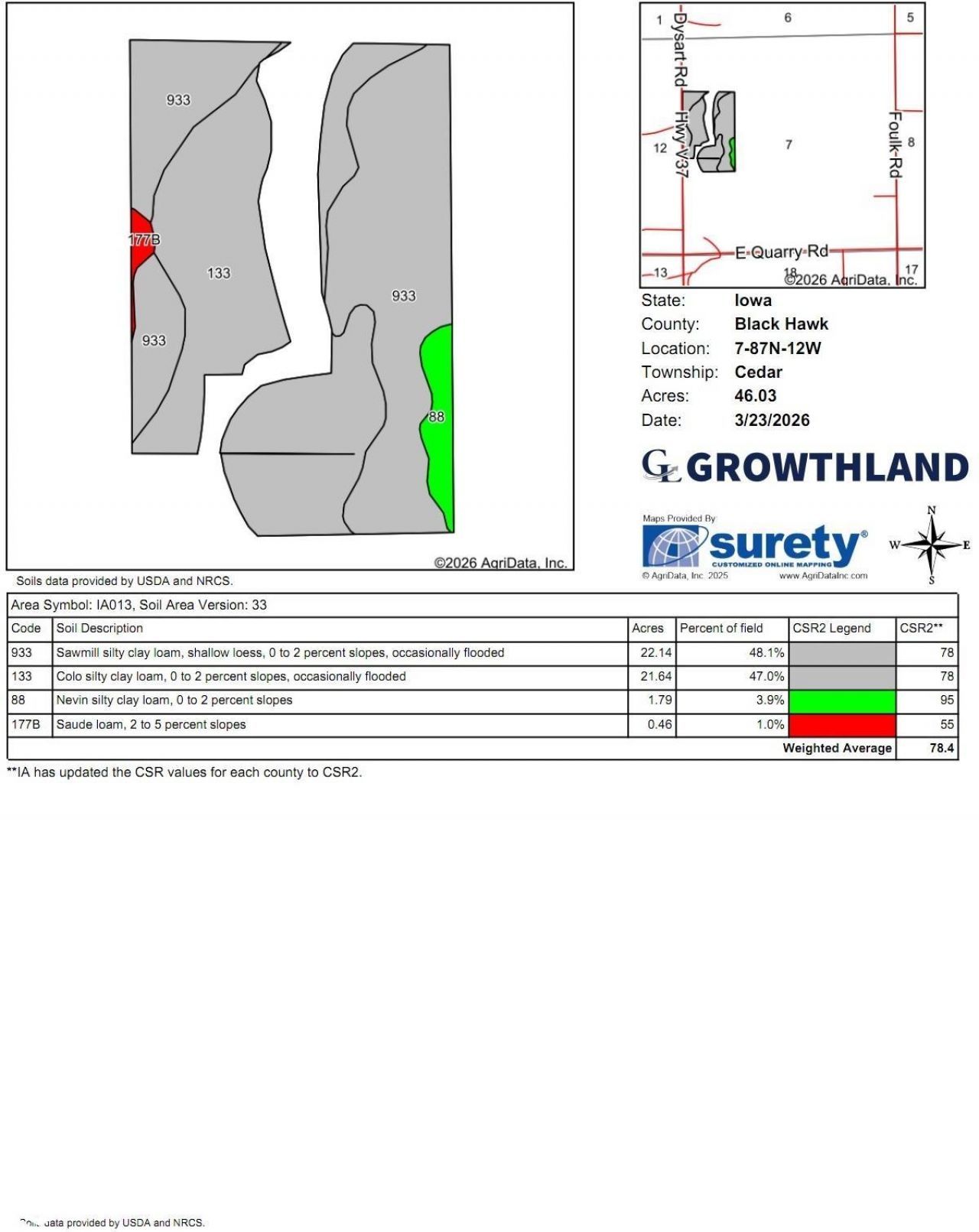 Conveniently located just 4.5 miles south of Waterloo along Dysart Road, this 58± acre tract offers excellent access and a strong CSR2 of 78.4. The layout provides income-producing CRP contracts and road frontage. Miller Creek along the east boundary adds the opportunity for recreational use, while the included home and outbuildings make this property ideal for investors, operators, or those seeking a rural living opportunity.