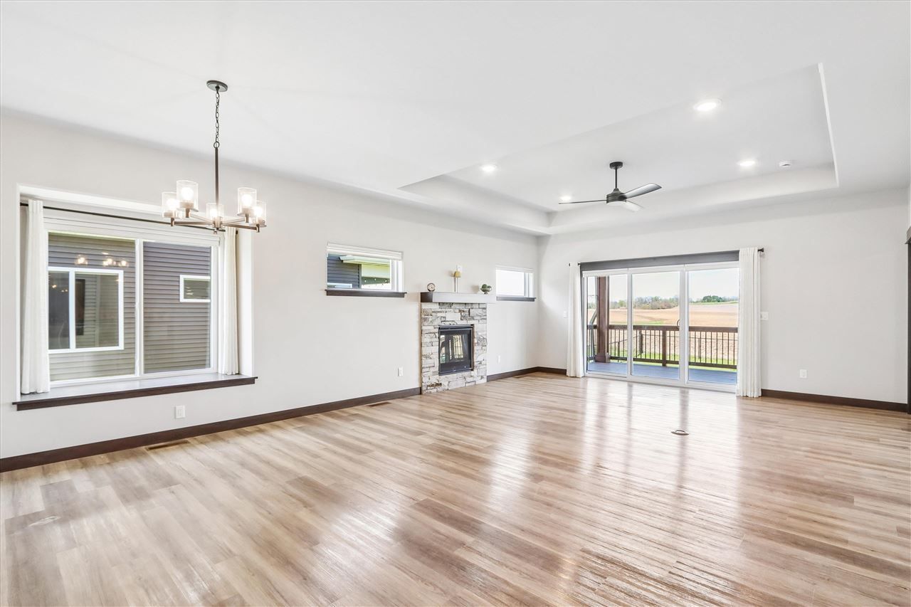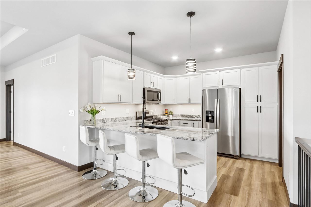 Better Than New! 4 Bed/3 Bath North Liberty Ranch Zero Lot offers a unique open concept floorplan w/ double access to primary suite, spacious 16 x 10 covered porch w/ stairs to lawn and a prime location! Upgraded features include bright white kitchen cabinets, SS appliances, granite countertops, contemporary subway tile backsplash, gas stove, breakfast bar, LR gas fireplace w/ stacked stone, sable black lighting fixtures, main level laundry room and wonderful primary bath w/ double sinks. Lower level has 2 finished bedrooms, storage room w/ utility sink, full bathroom and open family/rec room. Bonus features include: Fresh Sherwin Williams paint throughout, two custom bathroom glass shower doors, backyard fence, upgraded basement electric fireplace w/ floor to ceiling stacked stone & quality window treatments.