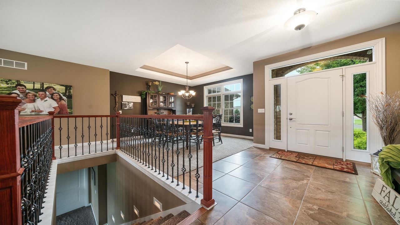 It's rare for a home like this to come back on the market. And with a price drop, it's an opportunity you don't want to miss! This stunning, immaculately maintained executive home is set on more than one professionally landscaped acre with manicured grounds and exceptional curb appeal. Offering 5 bedrooms, 3 full baths, and a heated extra wide 3-car garage with epoxy flooring and built-in cabinets, this home has it all. The main level boasts new carpet (2023), a formal dining room with tray ceiling and transom windows, and a spacious family room (tray ceiling) with a gas fireplace and tile surround. The gourmet kitchen features cherry cabinetry with crown molding, granite counters, a breakfast bar seating four, staggered cabinets, a wine fridge, metal backsplash, and a 5x5 walk-in pantry. (Refrigerator not included; dishwasher new in 2023.) A large dinette with deck access, mudroom with cubbies, arched openings, rounded corners, and central vac with dust pan feature add to the thoughtful design. The luxurious primary suite includes a tray ceiling with lighting, a spa-like bath with double sinks, granite counters, makeup vanity, walk-in tile shower, and expansive walk in closet. Main level laundry is oversized and functional. The lower level is ideal for entertaining, with 9' ceilings, a rec room featuring a stone wood burning fireplace, game room, workout room, spacious storage, and walkout access to a large patio. Garage door to utility room offers lawn mower storage area. A shared bath includes double sinks and a separate toilet and shower area. Convenient stairs to the garage add functionality. Outdoor living shines with a 24x15 composite deck (wood ceiling and fan), new hot tub (2024), firepit, Generac whole house generator, exterior lighting, and gorgeous landscaping. Additional updates: AprilAire (2017), water heater (2011). Don't miss this beautiful home combining elegance, comfort, and functionality in a serene country setting! Agent related.