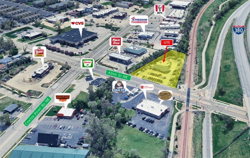 High impact location. This 1+ acre lot offers high visibility and strategic positioning immediately off I-380 at 42nd Street and close to Kennedy High School. The site is ideally situated between two signalized intersections, ensuring seamless access and exceptional exposure to high-traffic Interstate corridors. Perfectly suited for retail redevelopment, particularly quick-service restaurants or small retail strip. Configuration would work well for a drive-through layout with ample space for parking. Adjacent to nature trail with direct trailhead access to lure good volume biker traffic. Large pylon signage. Includes parcels- 140912700200000, 140912701700000 and 140912701800000.