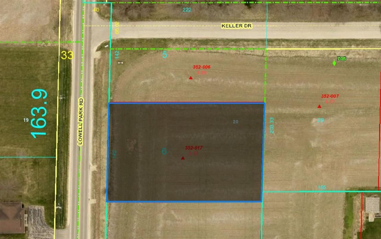 Beautiful edge of town subdivision with generous lots, 3/4 to 1 acre. Close to shopping, and parks. Variety of gently sloping, treed, and/or level lots. Ready for your purchase and build! Prime frontage on Lowell Park Rd. Spacious parcel of 1.10 acre approx. and commercially zoned. Two parcel numbers includes outlot 5 - #07-02-20-352-017 and #07-02-20-352-006