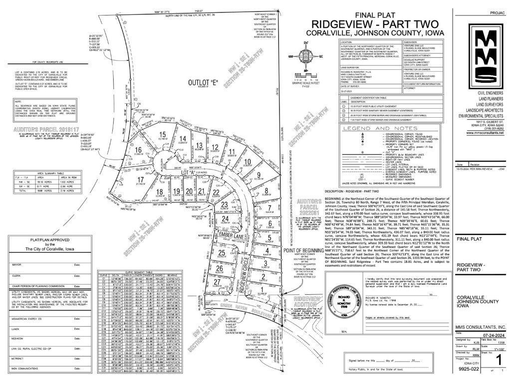 rand new Coralville subdivision with many walkout single family lots! Ridgeview Part 2 is located on the West side of the treeline from CCA's newest school, East Ridge Elementary. Several of the lots are partially wooded or have wooded view or back to a City of Coralville owned Outlot. Convenient location with easy access to the U of I Oakdale Reasearch Park, Coral Ridge Mall, Theisen's, Costco and other shopping. Nearby trails and other other future park space is planned by the City in the area.