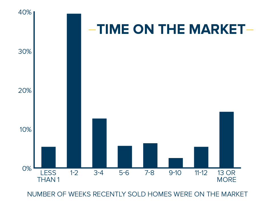 What your home is priced at from the start may indicate how quickly it will sell. Of homes that go on the market, half of them sell in a month, with a majority of those selling in the first two weeks.
